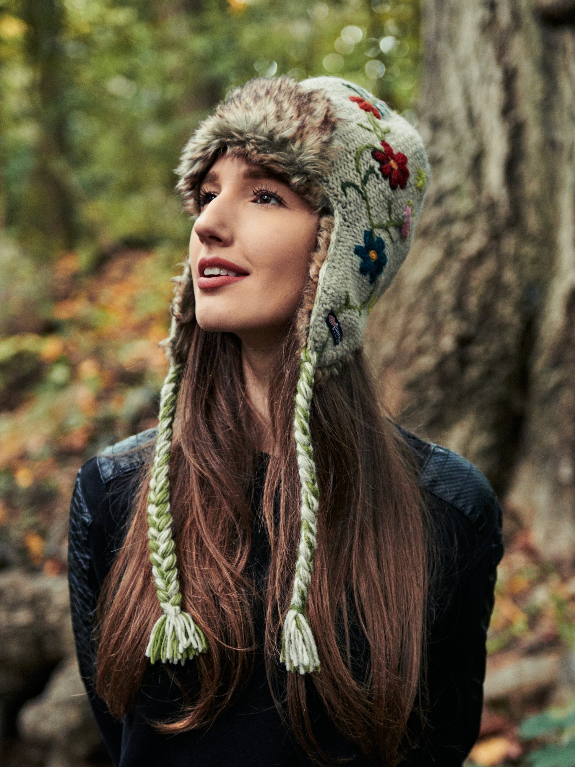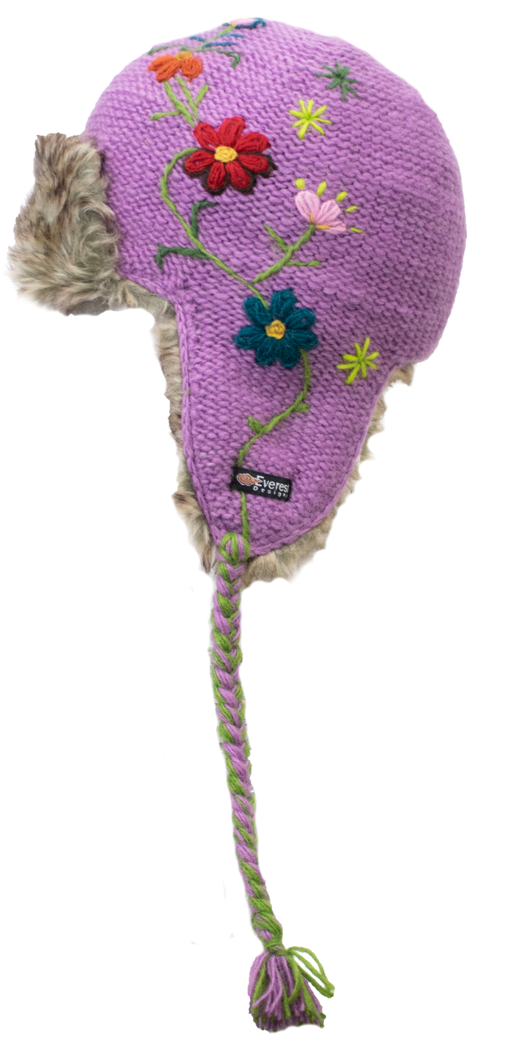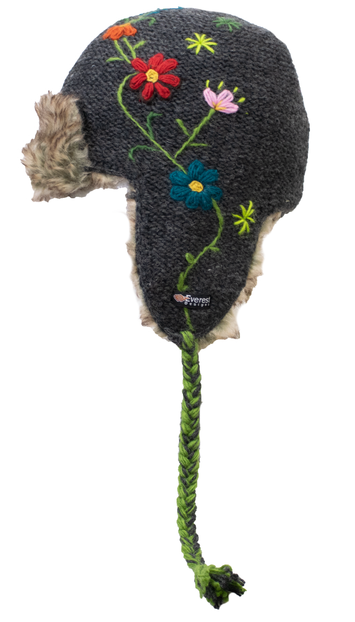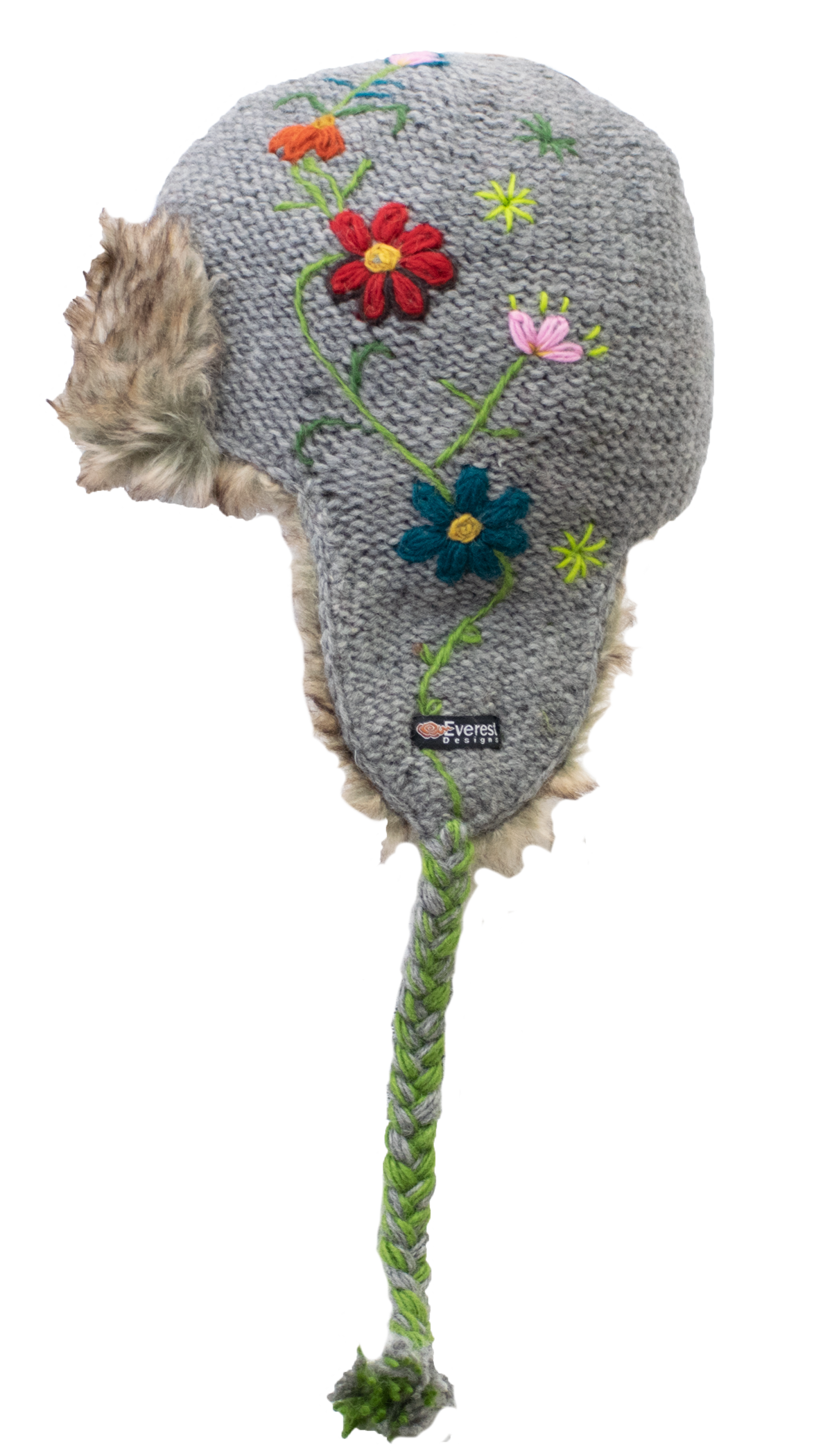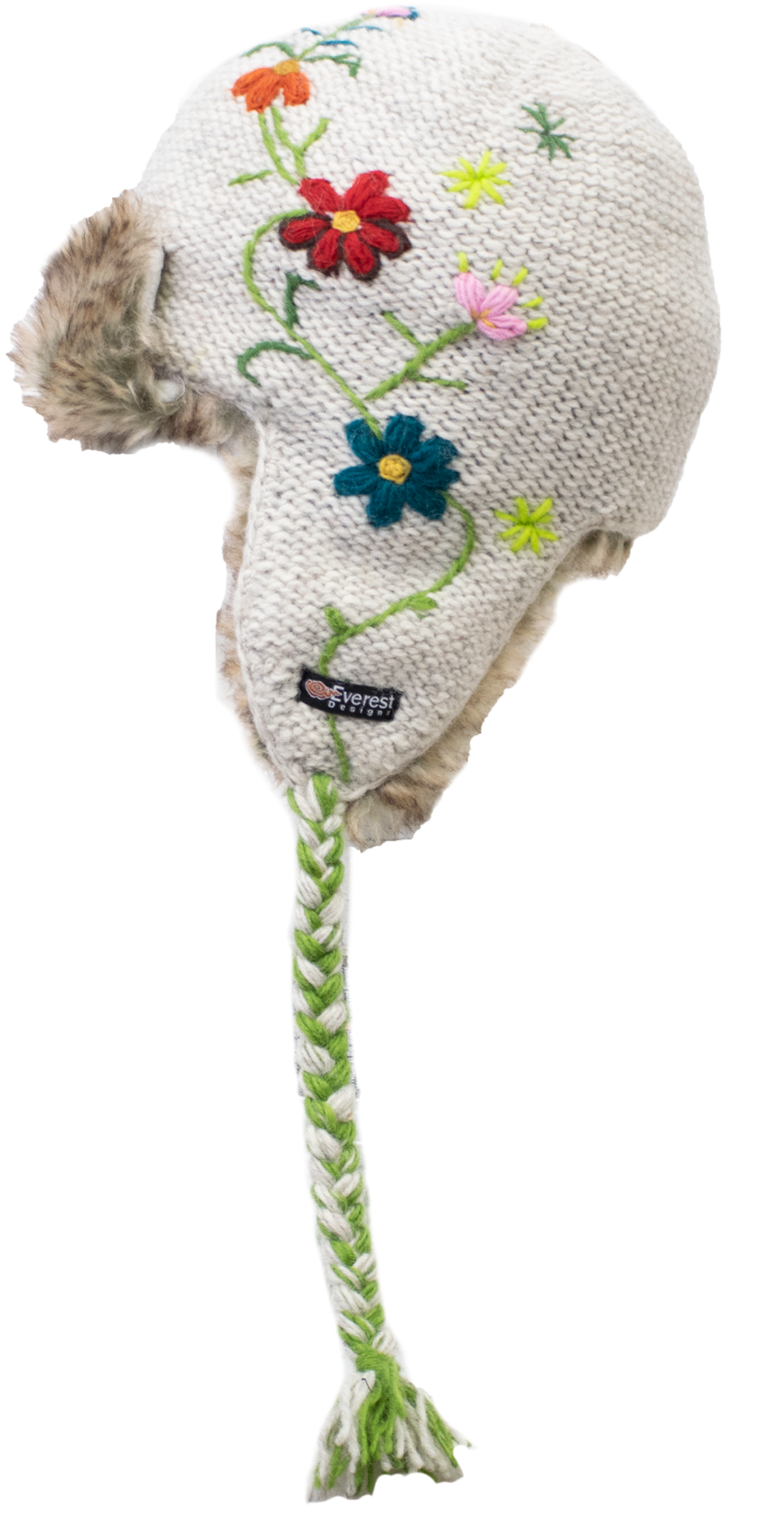The Reshma Earflap is a half faux fur-lined earflap. It combines the tassels of our classic earflap with the comfort and style of our fur hats. The reverse-knit base is topped with hand-embroider flowers down one side. The green embroidered stem meets the tassels of the hat and is braided in. The Reshma's Earflap also features a faux fur accent at the front.
